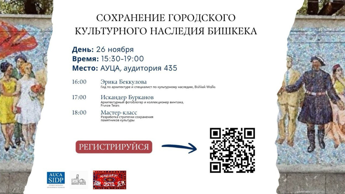 26-ноябрда БААУда Бишкектин шаардык маданий мурасын сактоого арналган иш-чара өткөрүлөт. Катышуучуларды архитектура жана урбанистика тармагындагы адистердин лекциялары жана маданий эстеликтерди сактоо стратегиясын иштеп чыгуу боюнча практикалык мастер-класс күтөт.