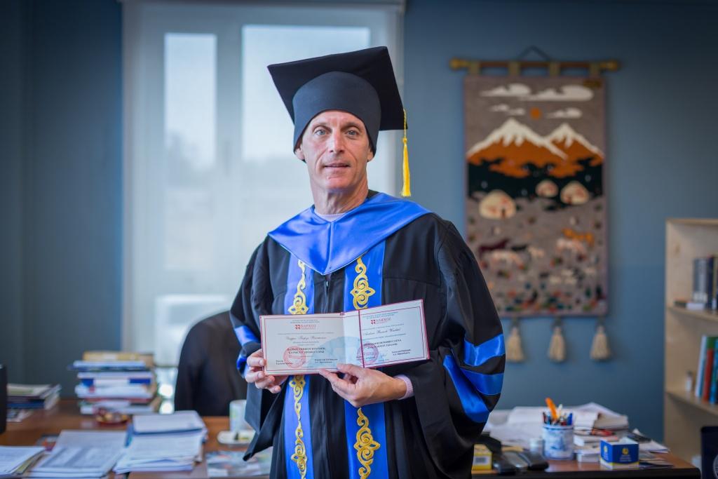«Это звание и ученую степень выдают людям, которые внесли огромный вклад в развитие образования и страны. Решением ученого совета мы дали звание Почетного профессора нашего университета Эндрю Вахтелю, президенту АУЦА. Он сделал очень много для развития высшего образования не только в Кыргызстане, но и в Центральной Азии. Я считаю, что АУЦА – это самый лучший вуз в Кыргызстане. Университет хорошо понимает, что нужно студентам. Процесс обучения строится таким образом, чтобы студенты в будущем стали успешными людьми, что совпадает с ценностями нашего Университета Нархоз. Это очень хорошо, если человек, который очень много сделал для образования, который правильно думает и двигается в том же направлении, что и наш университет, становится Почетным профессором Университета Нархоз.
