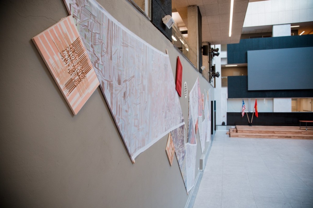 Дилбар: Работа в АУЦА заняла у нас около месяца, но подготовительный срок проекта насчитывает почти год. Первые эскизы мы представили уже в начале января 2016 года. Цель и основная идея нашего проекта – объединить уникальную живопись Варгас-Суареса и современное пространство архитектурного решения АУЦА с самобытной культурой кыргызов, с лучшими образцами декоративно-прикладного творчества среднеазиатских кочевых народов. Вся стена зала с лестницей состоит из серий панно, где ручная роспись по шелку соседствует с орнаментальной вышивкой. Сам проект – часть постоянно действующей выставки АУЦА, «Топографика».