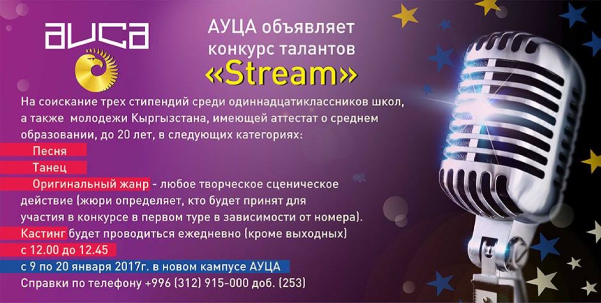 9 января 2017 года, в Американском Университете в Центральной Азии (АУЦА) стартует ежегодный вокально-артистический конкурс «Stream» среди учеников одиннадцатого класса средних образовательных школ Кыргызстана, а также молодёжи до 20 лет имеющей аттестат о среднем образовании, граждан Кыргызстана, на получение стипендий для обучения в АУЦА.