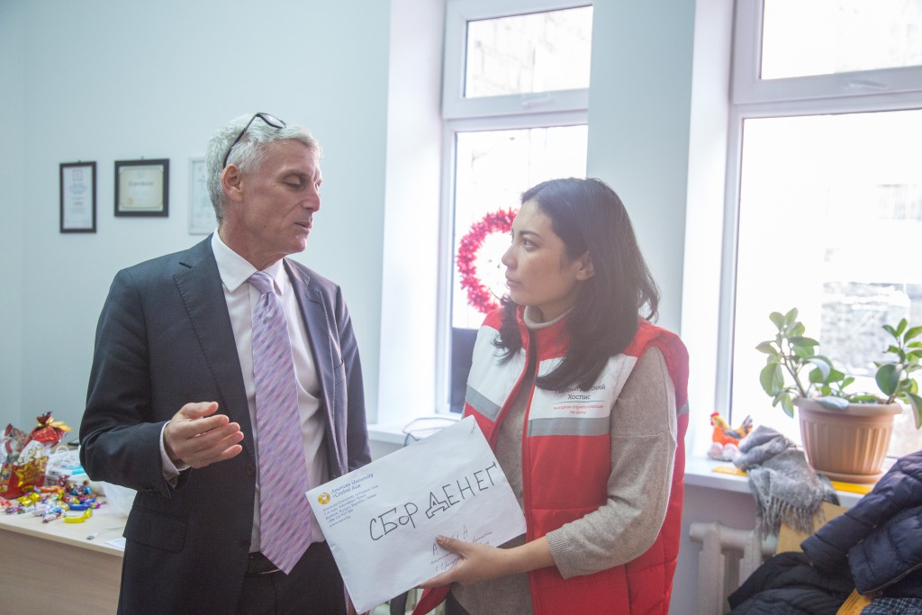 18 января 2017 года, Эндрю Вахтель, президент Американского Университета в Центральной Азии (АУЦА) с делегацией АУЦА посетили первый детский хоспис Кыргызстана. Целью визита стала помощь пострадавшим, родным и близким погибших в результате авиакатастрофы, которая произошла в селе Дача-Су, Чуйской области 16 января. Делегация АУЦА передала денежные средства для пострадавших, Динаре Аляевой, директору детского хосписа.
