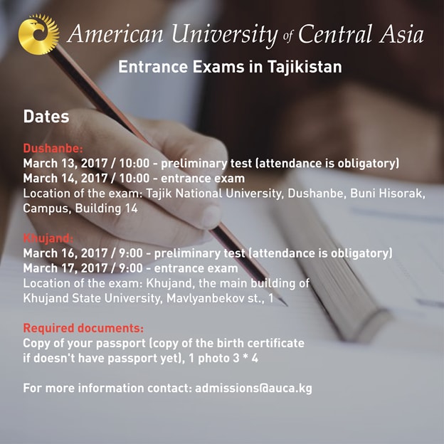 Американский университет в Центральной Азии объявляет о проведении выездных вступительных экзаменов на программу бакалавриат в республике Таджикистан гг. Душанбе и Худжанд.