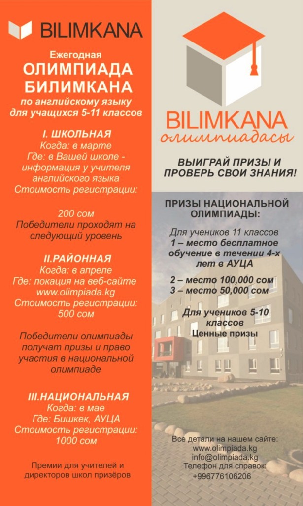 Напоминаем, школа «Билимкана» совместно с Министерством образования и науки КР и Американским университетом в Центральной Азии (АУЦА) объявляют о ежегодной олимпиаде по английскому языку «Олимпиада Билимкана». Олимпиада пройдет в три этапа: школьная, районная, национальная.