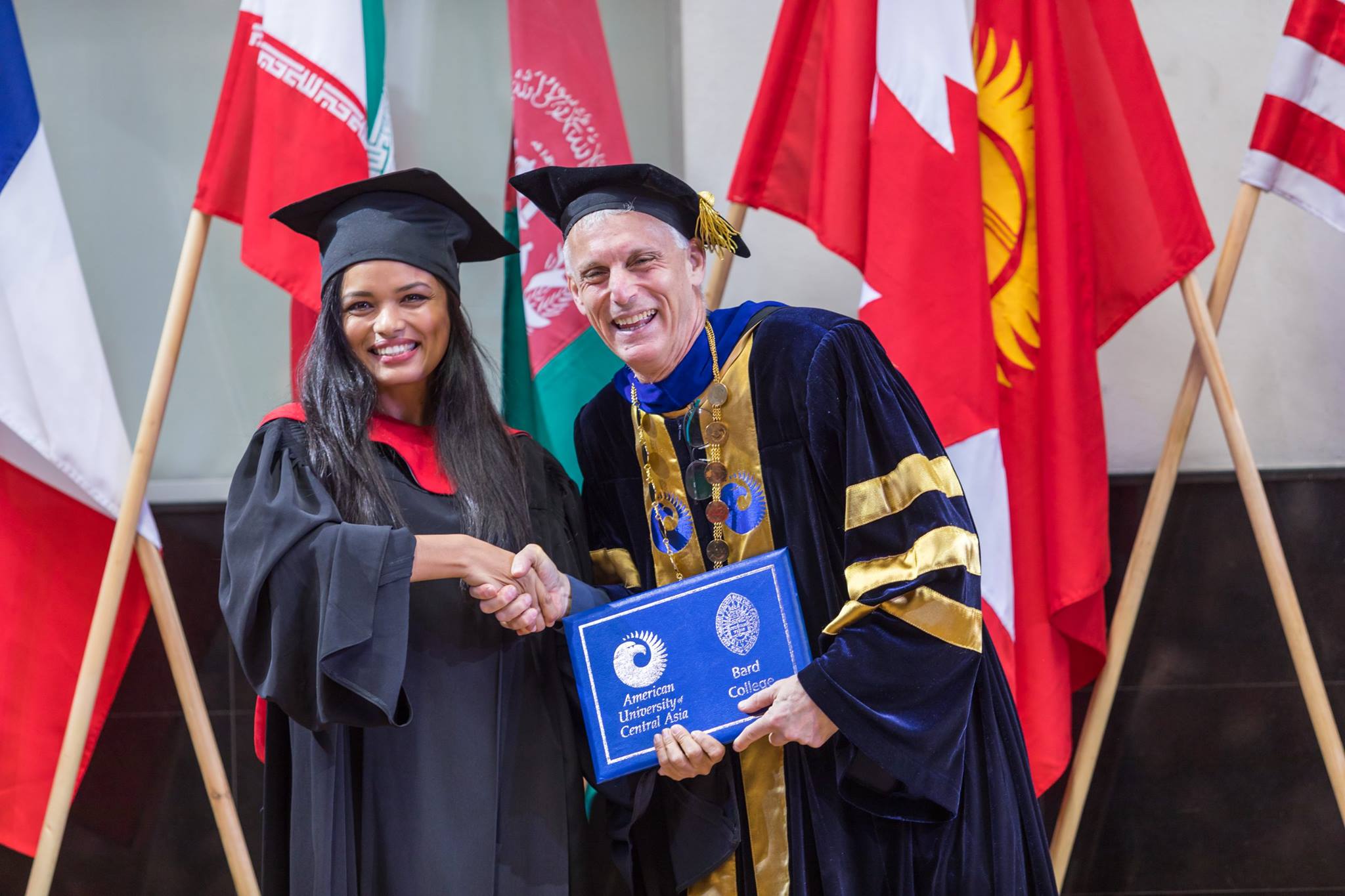 На сцене, под нескончаемые аплодисменты гостей и вспышки фотокамер, выпускники получали дипломы из рук президента АУЦА Эндрю Вахтеля, вице-президента Бард колледжа Джонатана Беккера и преподавателей родных факультетов.