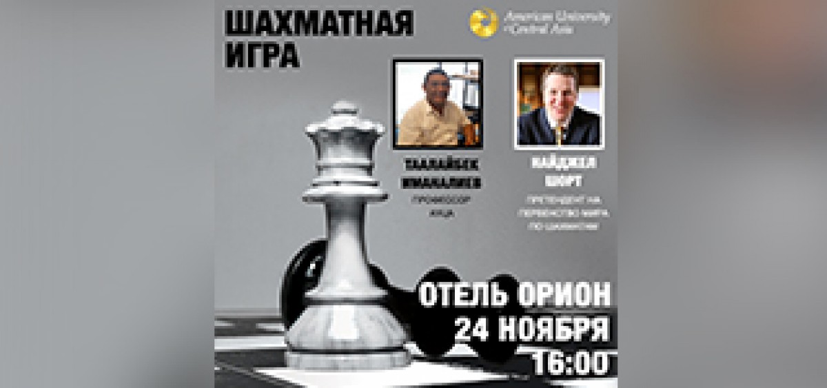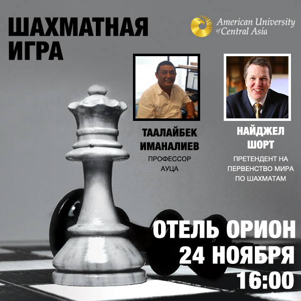 24 ноября в 16:00 в ресторане бизнес-центра Орион состоится шахматная игра между английским гроссмейстером - Найджелом Шортом и Кыргызстанцем, профессором АУЦА и Мастером Спорта СССР по шахматам - Талайбеком Иманалиевым.