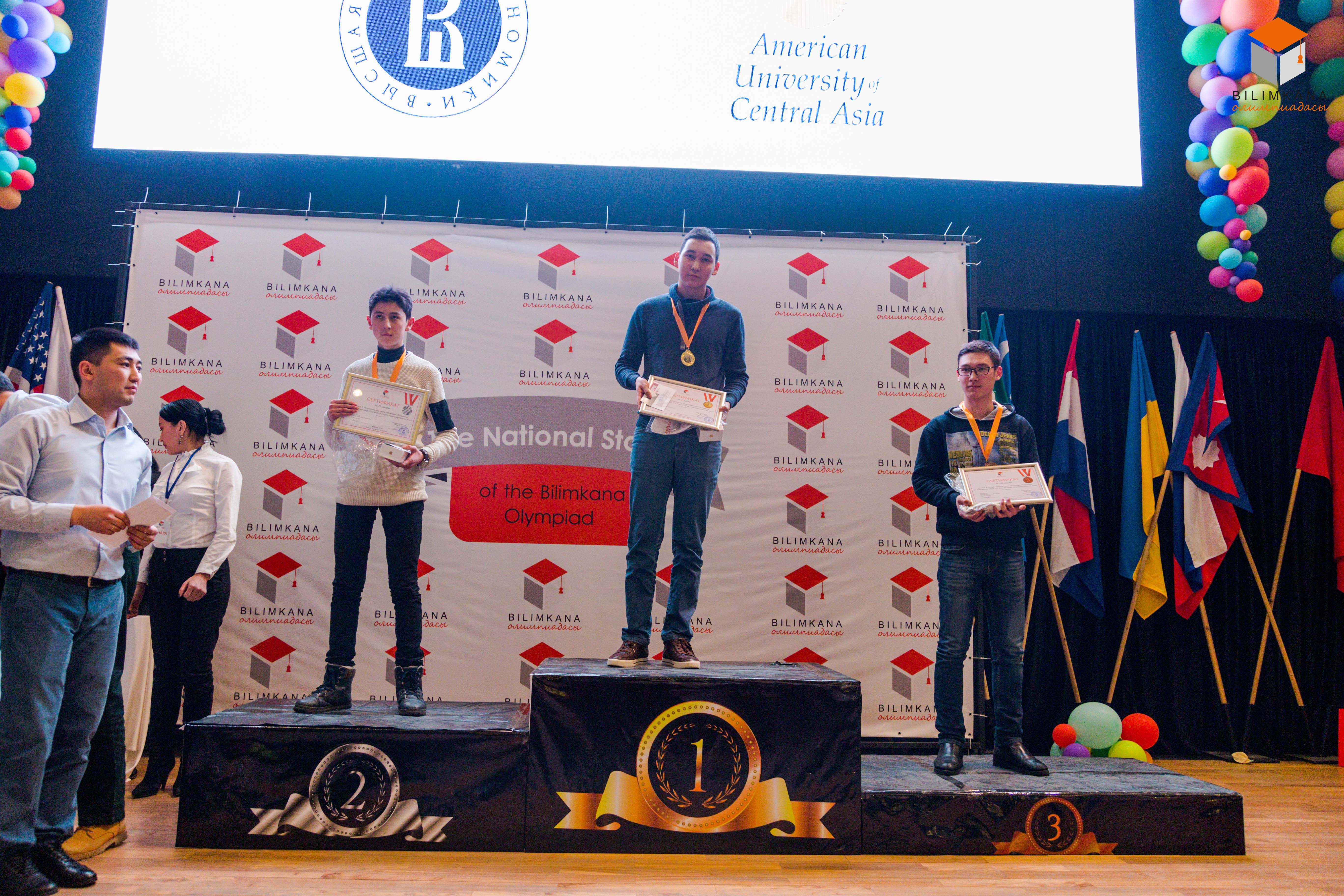 Обладателем главного приза Олимпиады - бесплатное обучение в Высшей Школе Экономики в г. Москве - стал Алчымбаев Атахан Насыбекович, ученик 11 класса школы-гимназии №67 города Бишкек. По итогам Олимпиады 38 участников из различных областей страны были награждены ценными призами - смартфоны iPhone 7 и 7 Plus, смартфоны Xiaomi, денежные призы и многими другими приятными бонусами от спонсоров Олимпиады Билимкана. Призерами стали учащиеся из Бишкека, Оша, Иссык-Куля, Чуйской области и Баткена. Полный список имён победителей Олимпиады Билимкана опубликован на сайте www.olimpiada.kg.