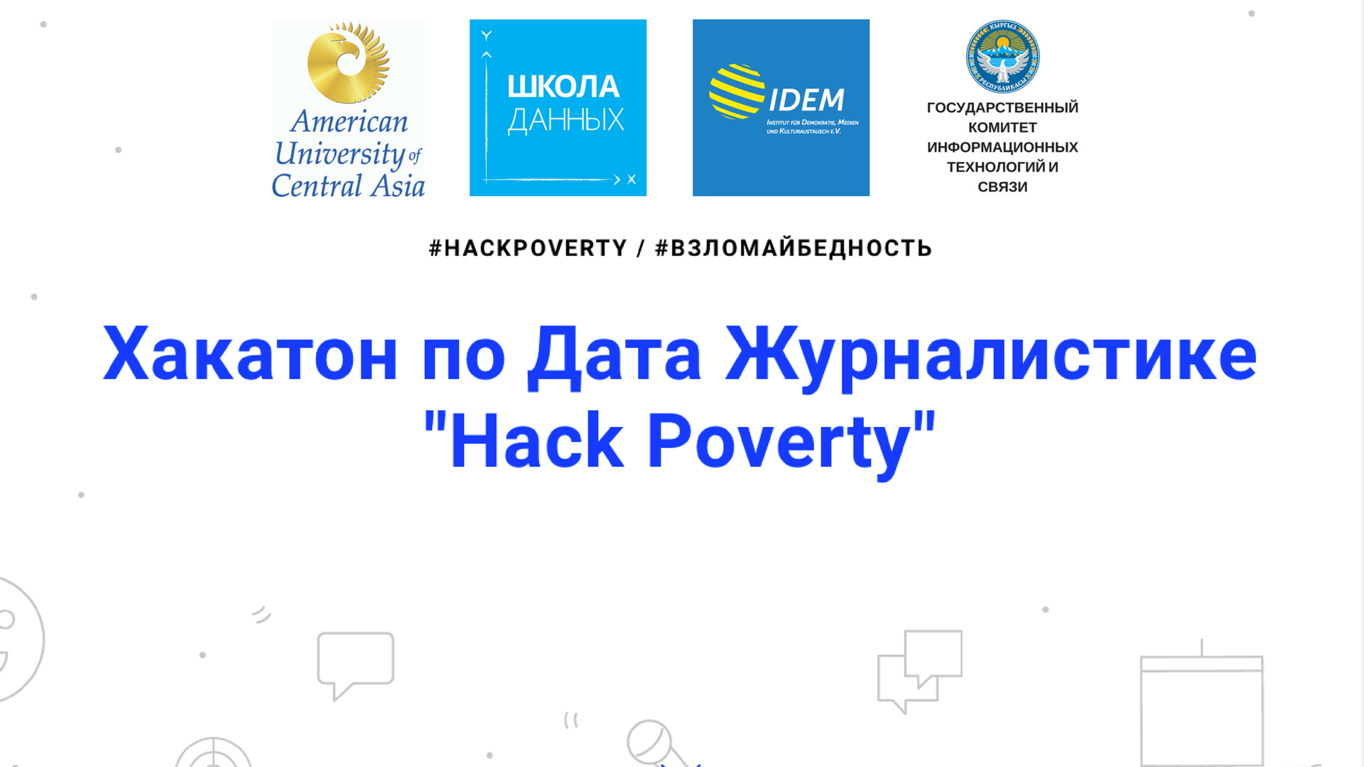 Американский университет в Центральной Азии совместно с Школа Данных Кыргызстана при поддержке IDEM (Institute for Democracy, Media and Cultural Exchange) проводит в Бишкеке первый хакатон по дата журналистике на тему “Взломай Бедность”. Хакатон пройдет с 3 по 4 марта в Американском Университете Центральной Азии (7/6 Аалы Токомбаева), с двумя подготовительными сессиями 21 и 28 февраля в Ололохаус (Ибраимова 103). Данное мероприятие приурочено ко Всемирному Дню Открытых Данных (Open Data Day), который отмечается ежегодно в начале марта.