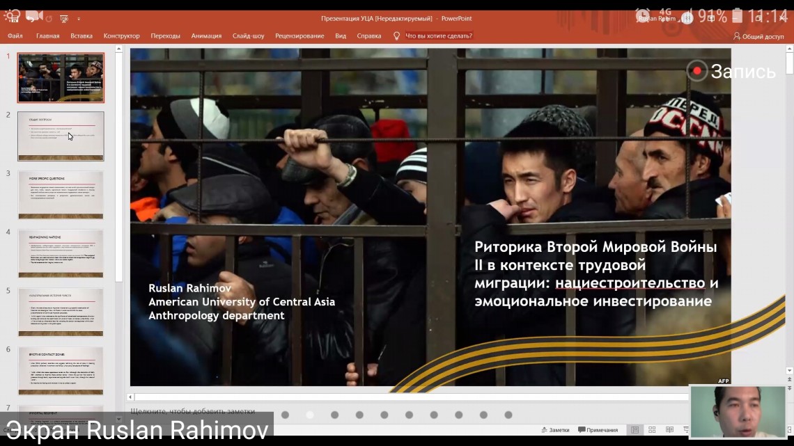 В рамках сотрудничества с ОшГУ доцент факультета «Антропология», подразделения «Социальные науки» АУЦА, доктор философских наук, PhD Руслан Рахимов прочитал онлайн-лекцию для студентов и магистрантов ошского университета. Тема лекции: «Риторики о Второй мировой войне в контексте миграции кыргызстанцев в РФ».