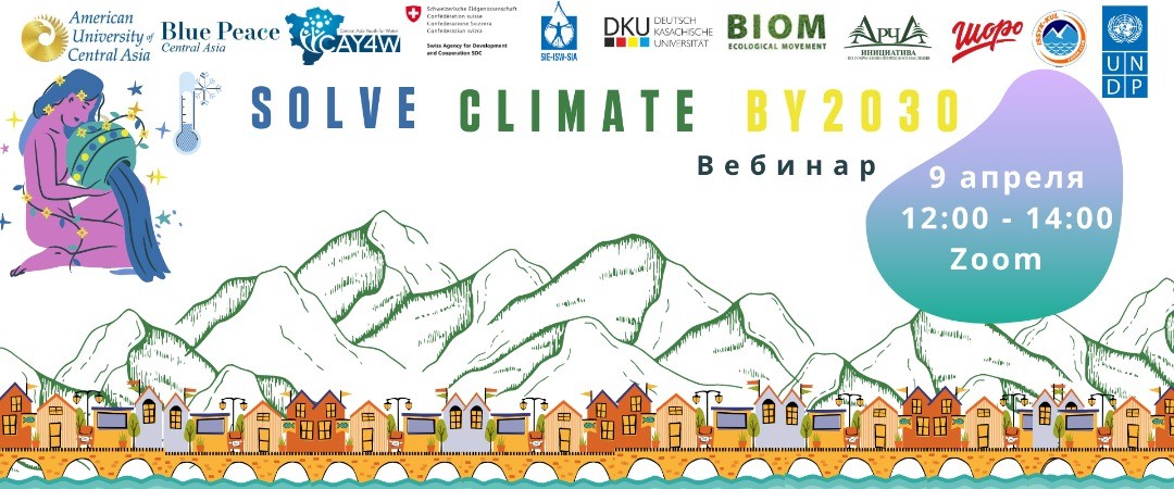 Американский университет в Центральной Азии совместно с партнерами: Центрально-азиатская молодежная сеть по воде (CAY4W), Климатическая перспектива ПРООН: обновление ОНУВа, Проект «Устойчивость молодежи к изменению климата», ОФ «Инициатива Арча», ЗАО «Шоро», "Ыссык-Кол Жаштар Клубу», проведет вебинар в рамках глобальной образовательной программы Бард колледжа «Solve Climate by 2030» (Решить вопрос климата к 2030 году). Вебинар в Кыргызстане состоится 9 апреля 2021 года с 12.00 до 14.00 по Бишкекскому времени.