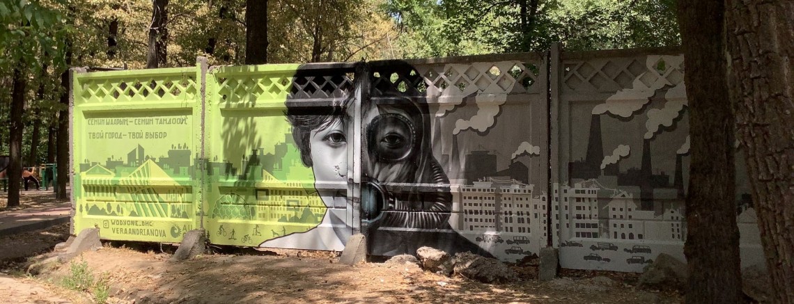 В физкультурном сквере, расположенном на пересечении улиц Ю. Абдрахманова и И. Ахунбаева осуществлен очень интересный проект под названием «Твой город – твой выбор!», объединивший проблемы экологии, права человека и стрит-арт. Его инициатором стала Расым Маратова, окончившая в этом году факультет «Экономики» АУЦА.