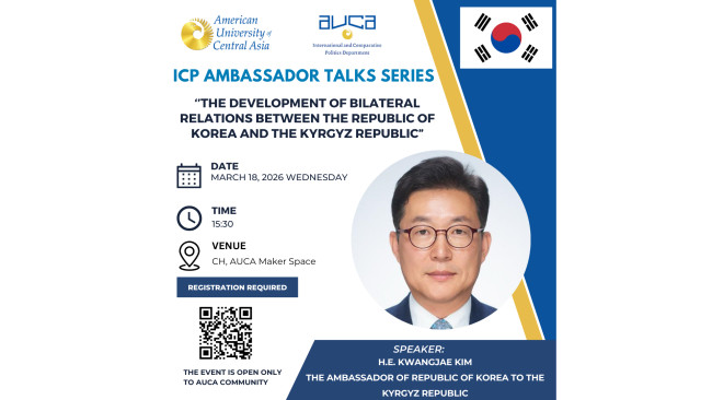 Department of International and Comparative Politics invites you to the Ambassador Talks with Mr. Kim Kwangjae, the Ambassador of the Republic of Korea to the Kyrgyz Republic,  on March 18, at 15:30, in the CH, AUCA Maker Space.... Read More